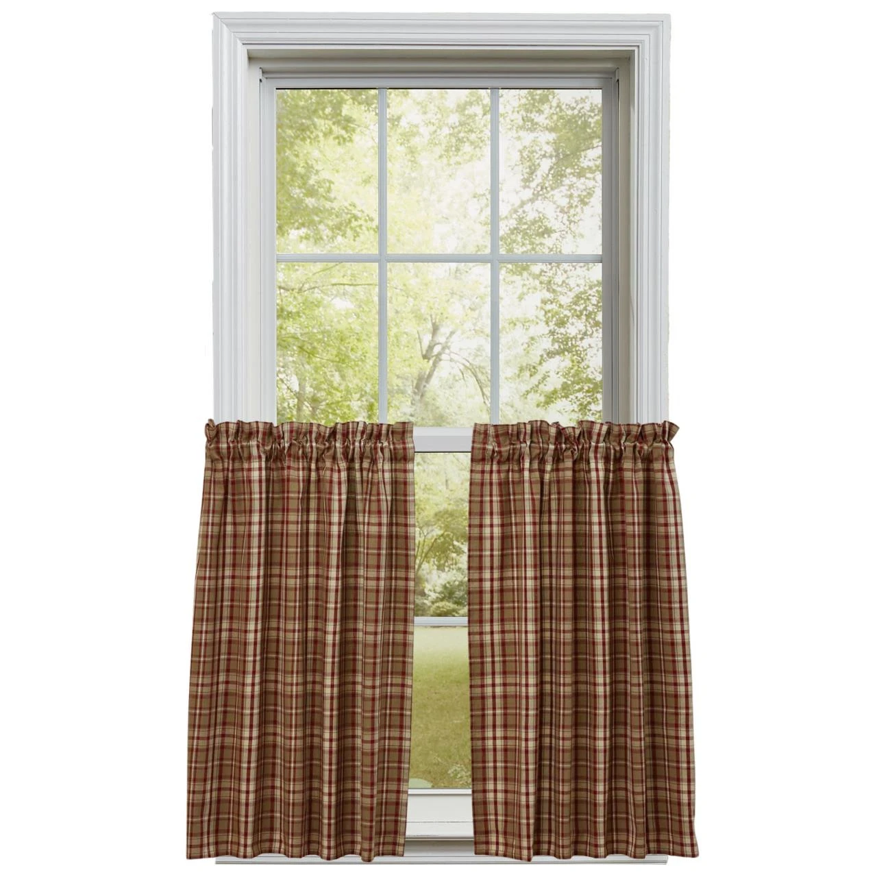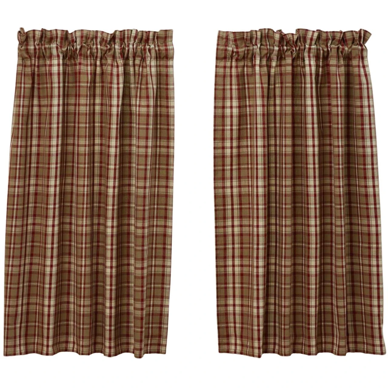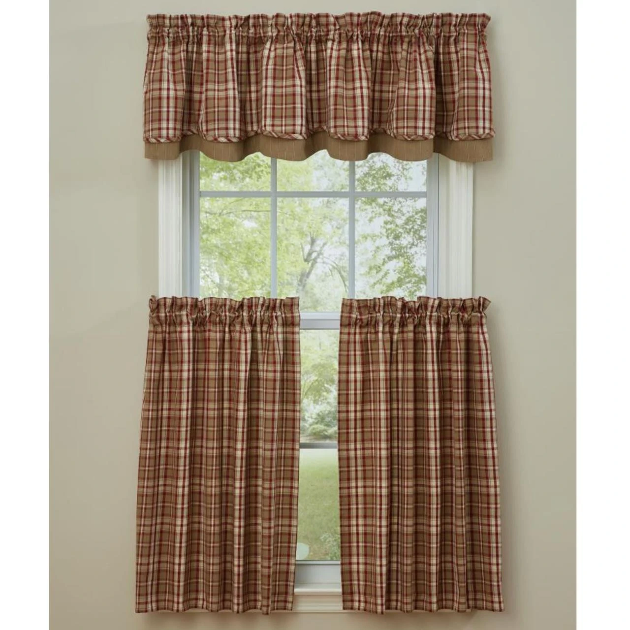 Featuring soft, warm tones of red, tan & ivory, these Cumberland Tiers add a touch of serenity to your home! The pretty plaid pattern oozes classy, traditional style that enriches any decor! So lovely on their own, or pair with coordinating valance for a more striking appeal!