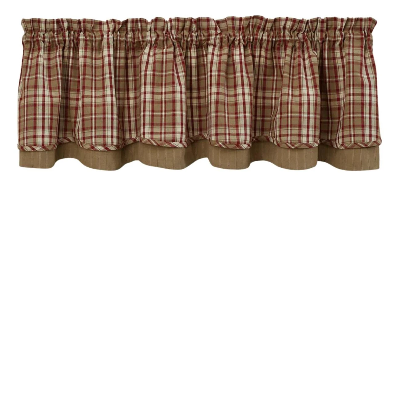 Featuring soft, warm tones of red, tan & ivory, this Cumberland Lined Layered Valance adds a touch of serenity to your home! A pretty plaid fabric lays gently over a tan fabric for a beautiful layered look! So lovely on its own, or pair with coordinating tiers for a more dramatic appeal!
