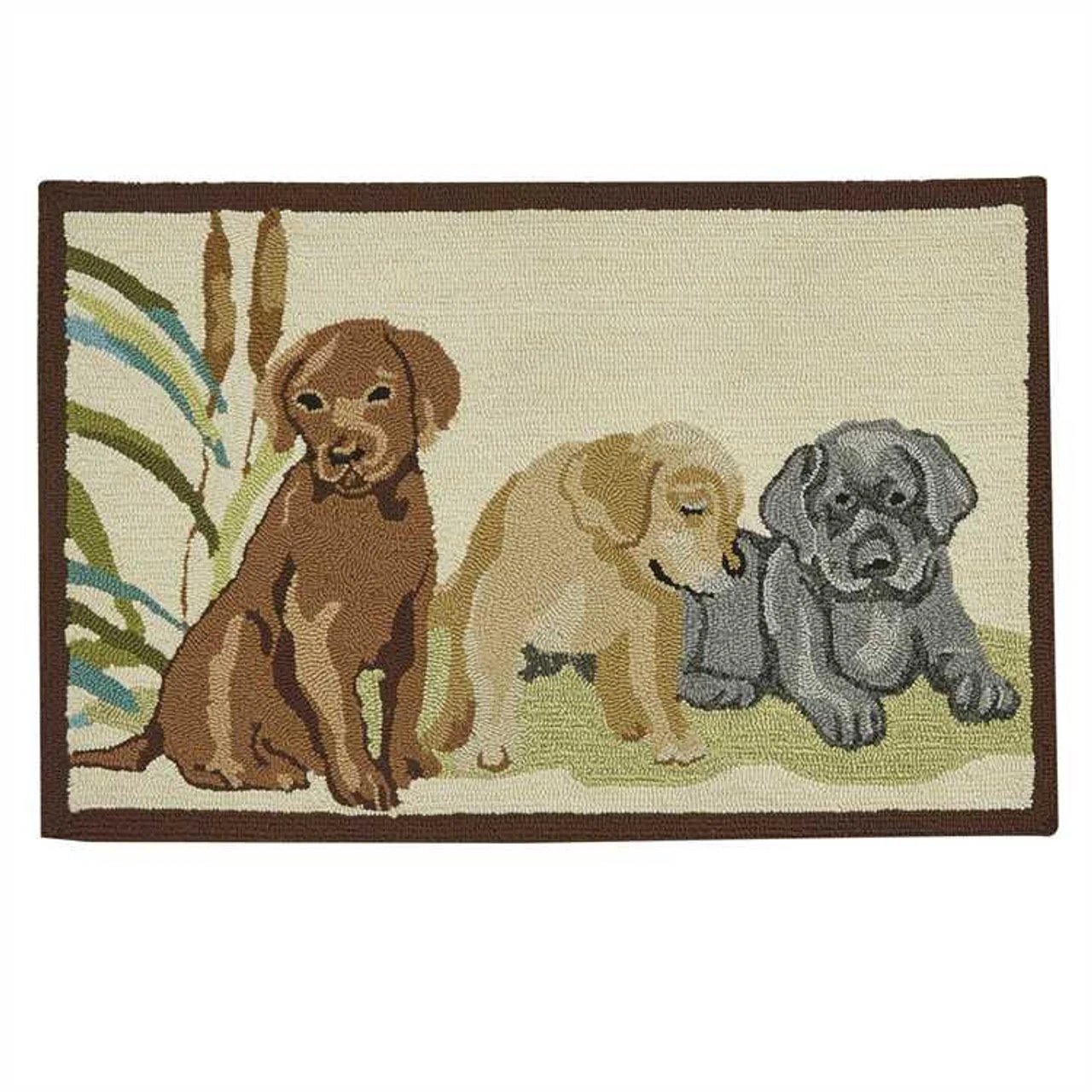 This cute indoor/outdoor hooked rug features three cute labrador puppies, one of each color, sitting amongst some beautiful lake cattails. Neutral colors make this rug easy to incorporate into your home decor. It also looks great with our Lake Livin’ Collection!