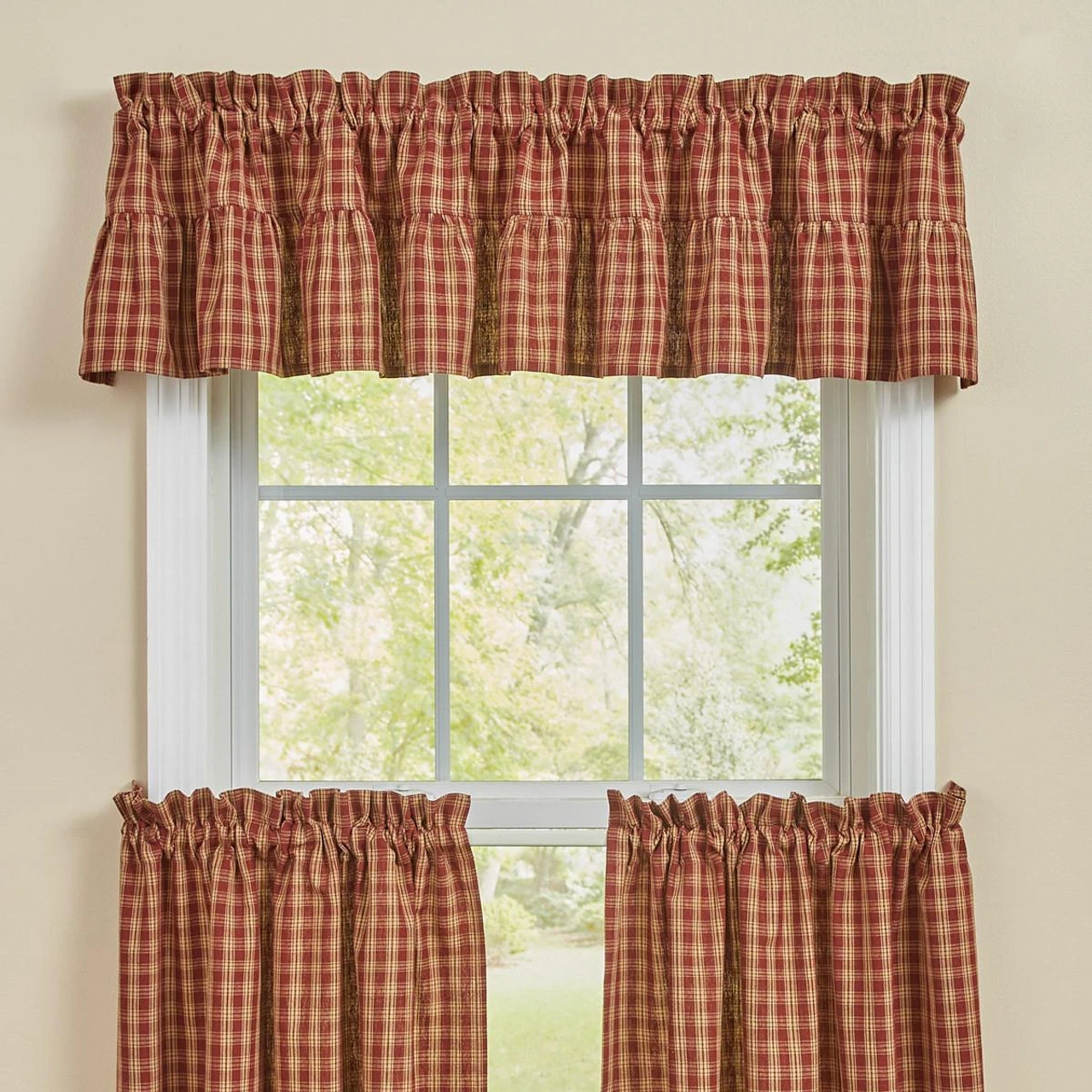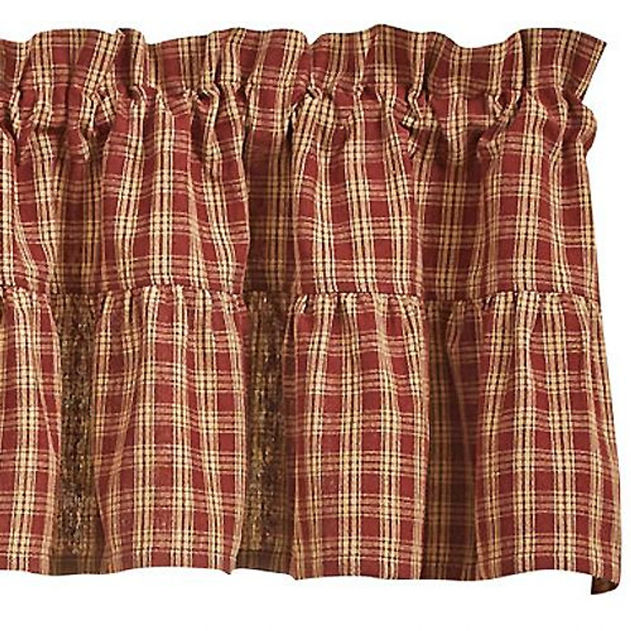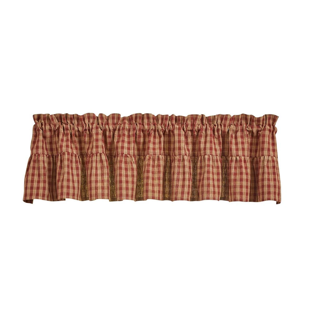 Add a gorgeous country accent to your window with the Sturbridge Plaid Wine Ruffle Valance by Park Designs! The gorgeous plaid pattern in wine and farmhouse tan gives classic style! The ruffles are the perfect finishing touch!