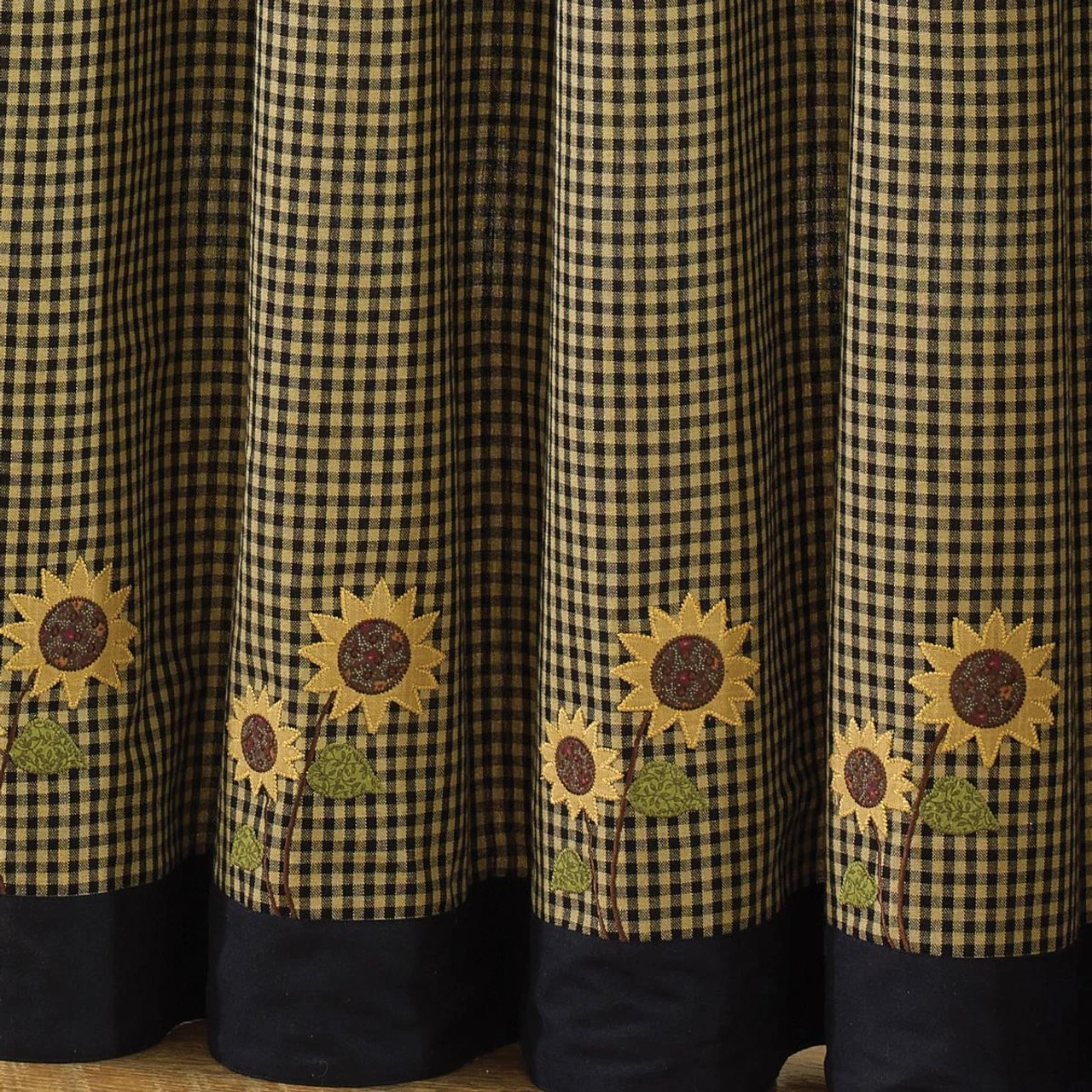 Add a ray of sunshine to your decor with this Sunflower Check Shower Curtain! Featuring a pretty tan & black plaid, it is further enhanced with intricate appliqued sunflowers above a solid black band along the bottom border. Beautiful!
