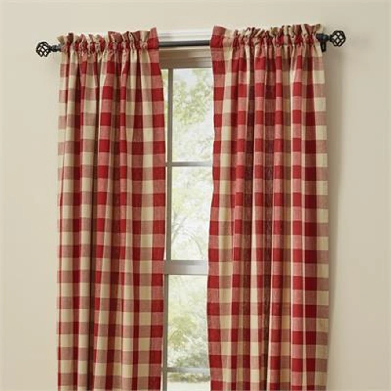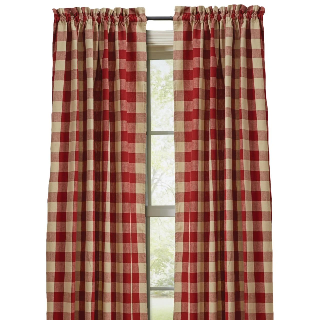 The Wicklow Garnet Panels offer a sweet, uncomplicated look! The warm garnet & tan blends beautifully to provide a classic farmhouse check that complements any country home design! These unlined panels come with fabric tiebacks for a little versatility in style! Chic on their own, or pair with coordinating valance for a more dramatic appeal!
