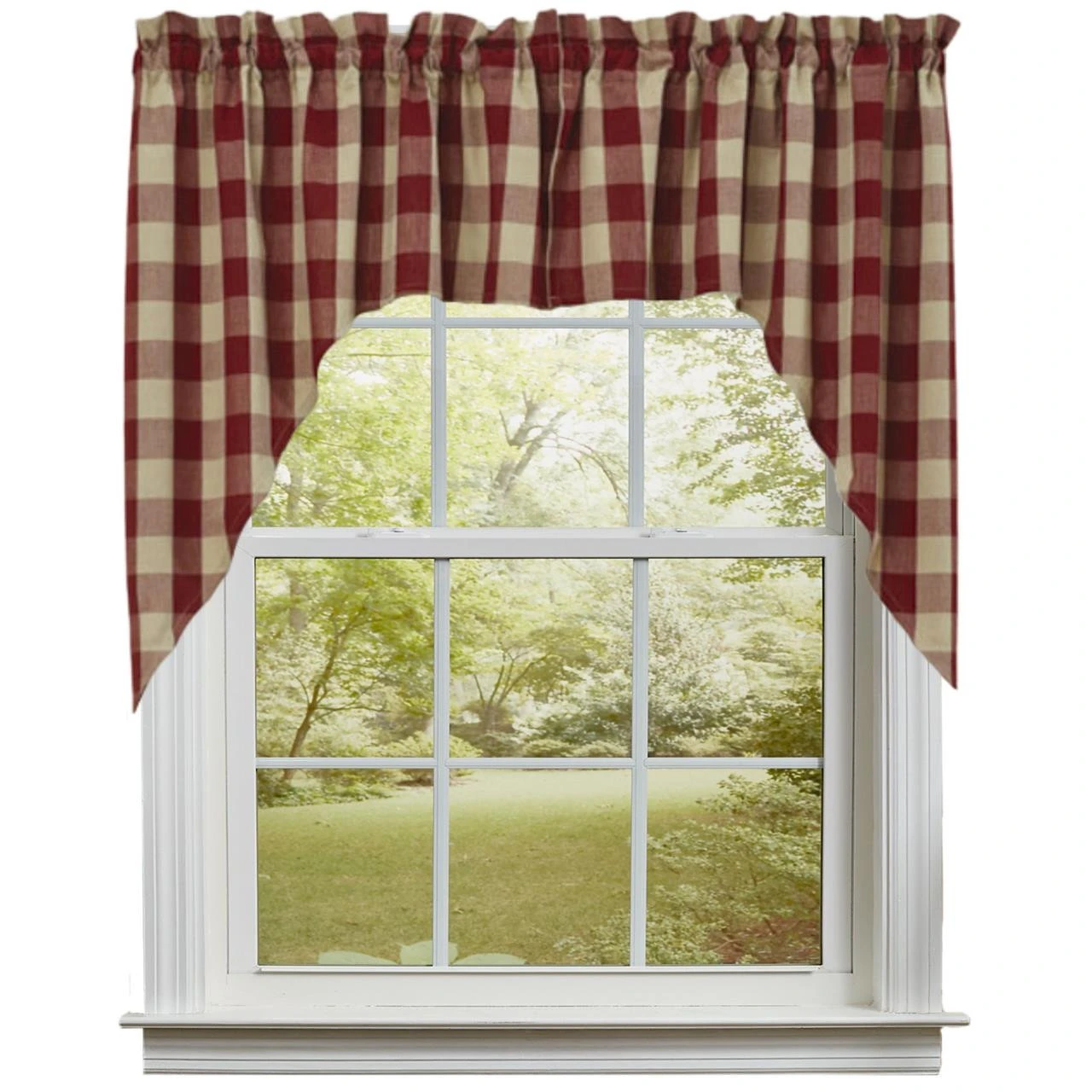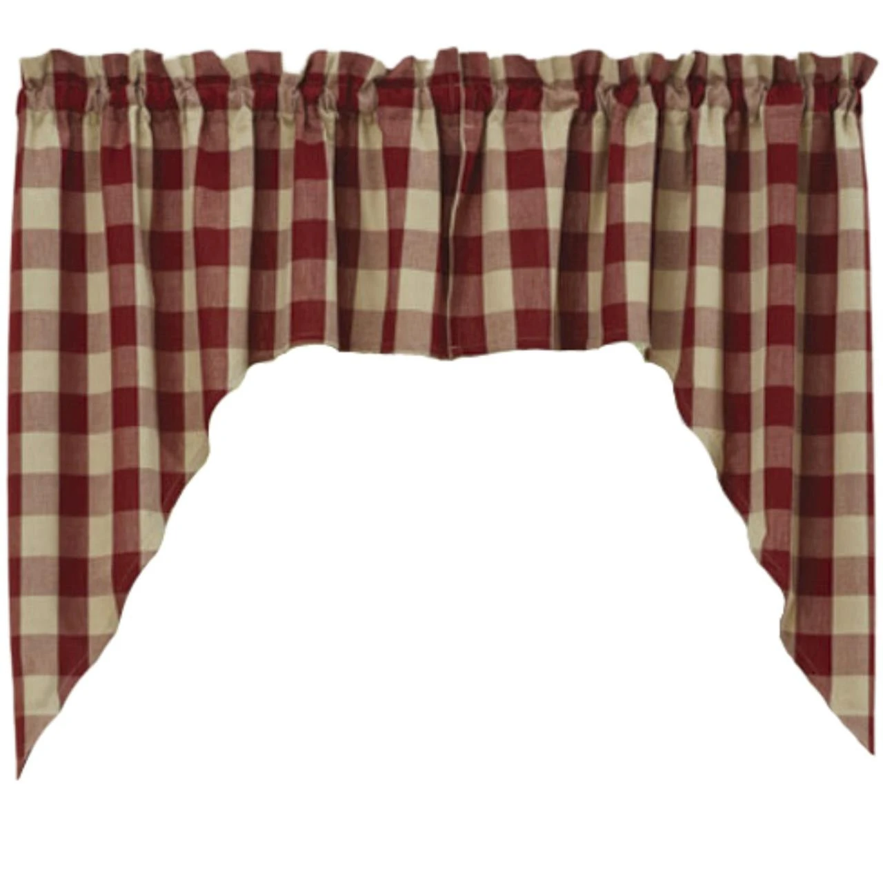These lovely Wicklow Garnet Swags provide the perfect window treatment for any country home! Sporting a warm garnet & tan traditional check pattern, this unassuming design is both pretty and practical! They come unlined to allow soft light to filter through! Perfect on its own, or pair with coordinating tiers for a more dramatic appeal!