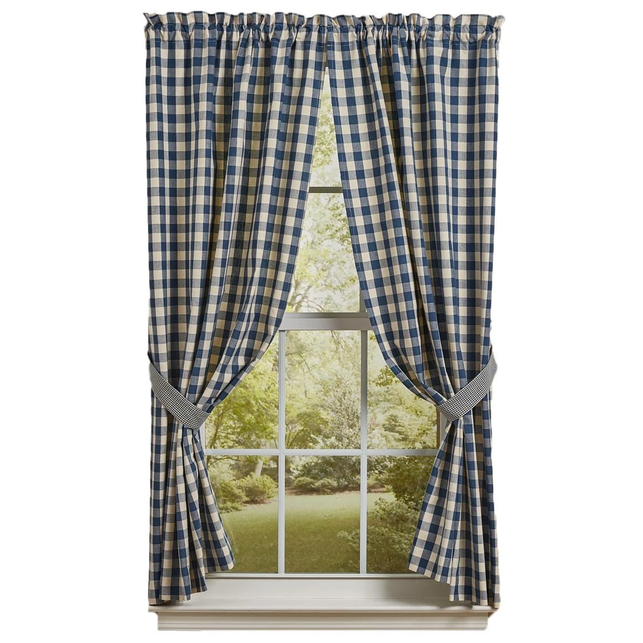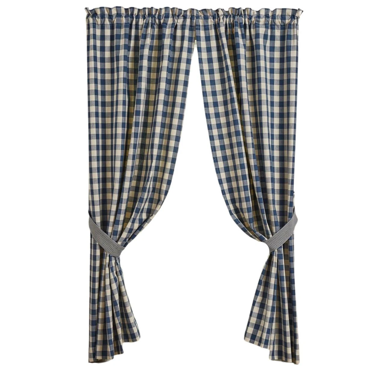 The York Blue Panels in country blue and antique white feature large gingham checks trimmed with tiebacks of small gingham checks. Crisp and pretty, these panels are fresh and sure to brighten up your windows!